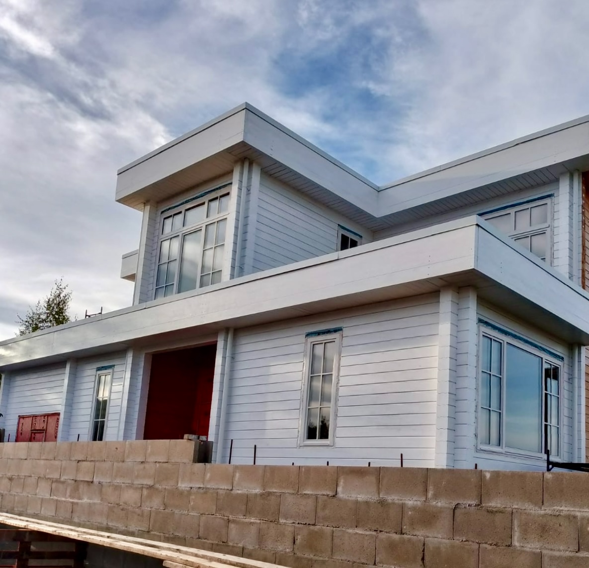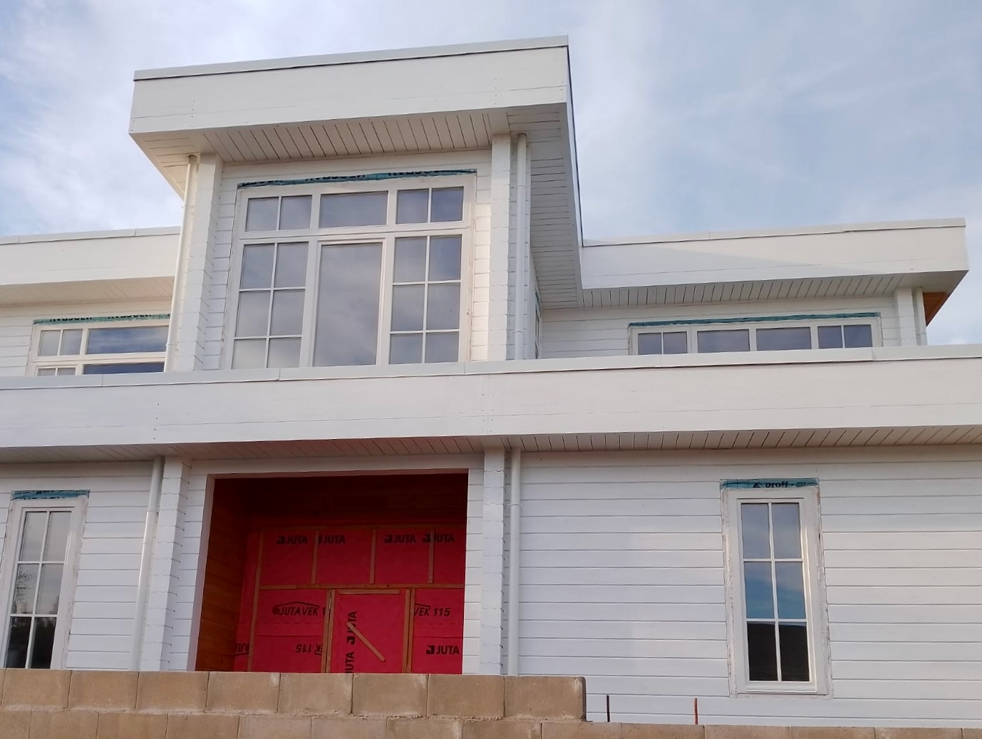 Дом строится из клееного бруса собственного производства из сосны сечением 205х185 мм. Общая площадь дома составляет 426,98 квадратных метров. Это полностью индивидуальный проект нашего заказчика.