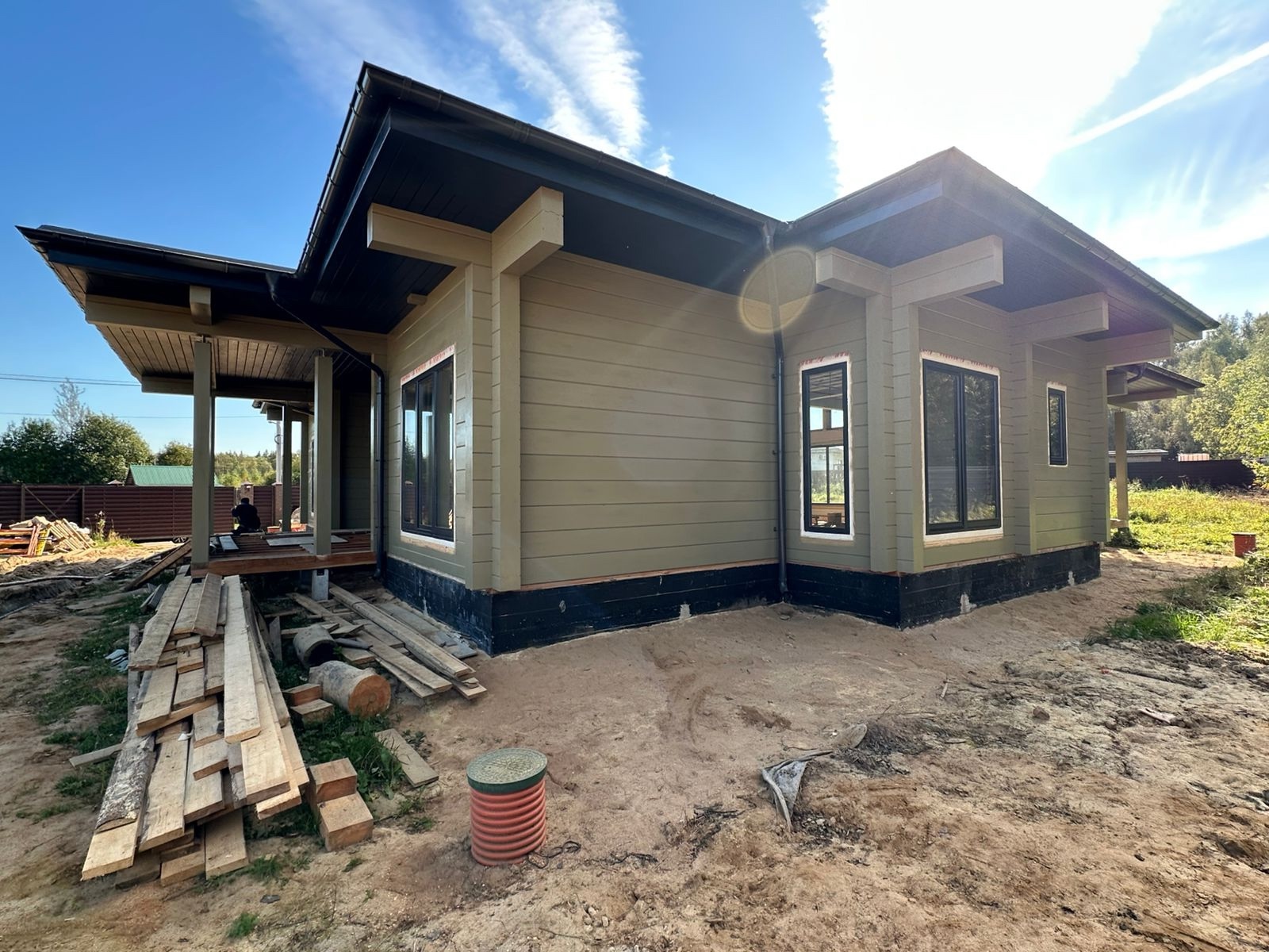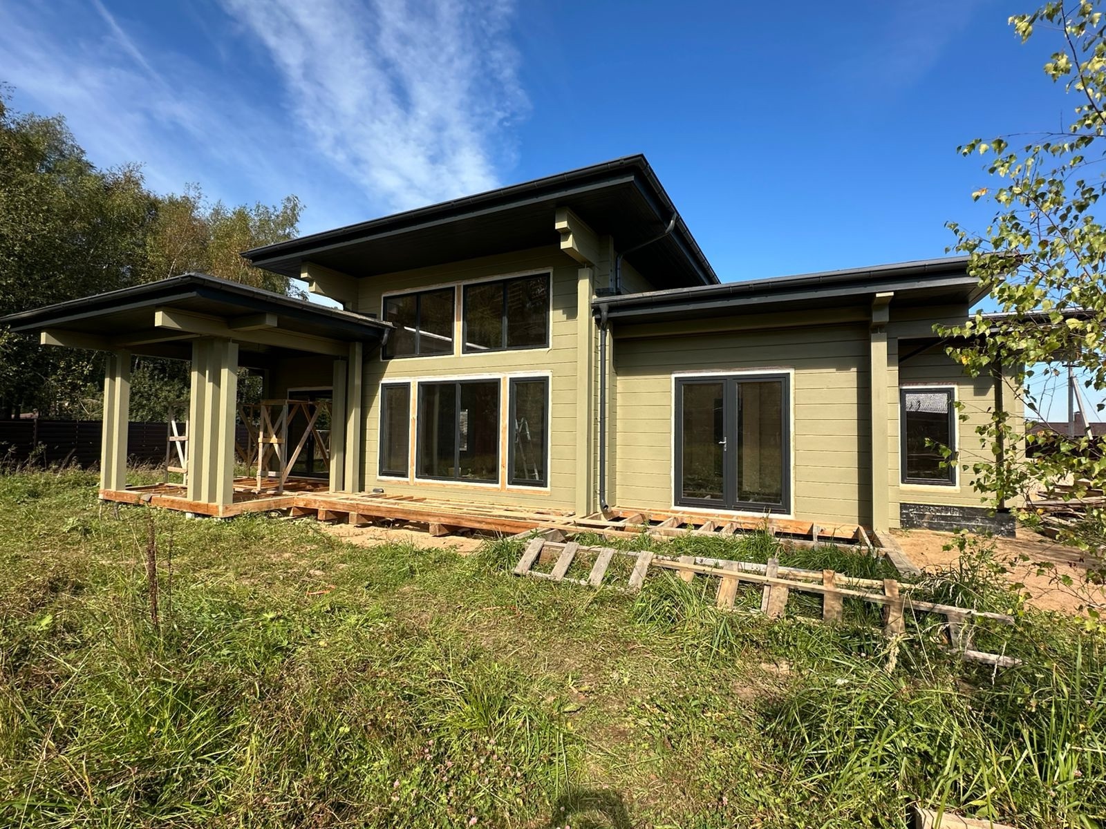 Наша бригада завершила внешнее окрашивание дома. В строительстве мы использовали клееный брус собственного производства из сосны сечением 205х270(h) мм. Это полностью индивидуальный проект нашего заказчика. Площадь дома составляет 290,23 м2.