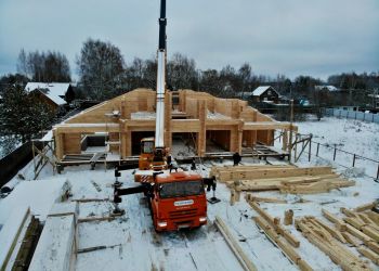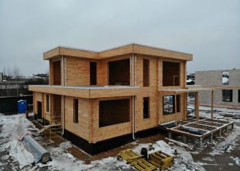 Наша бригада завершает работы по сборке сруба дома. Далее мы приступим к монтажу стропильной системы. В строительстве мы используем клееный брус собственного производства из сосны сечением 205х270(h) мм. Общая площадь дома составляет 424,61 м2. За основу проекта был взят наш типовой проект Турин, но заказчик внес свои индивидуальные изменения.