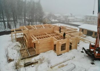 Сейчас наша бригада выполняет монтаж балок перекрытия. В строительстве дома мы используем клееный брус собственного производства из сосны сечением 205х270 мм. Общая площадь дома составляет 290,23 квадратных метров. Это полностью индивидуальный проект нашего заказчика.