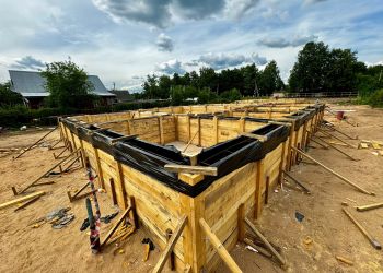 Наша бригада приступила к работам по устройству фундамента дома и бани. Это индивидуальный проект нашего заказчика. Площадь дома составляет 256,38 м2 и бани 164,3 м2.