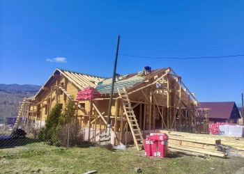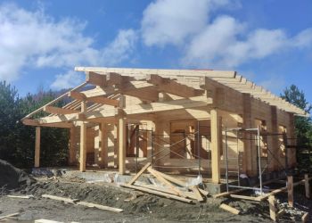 Наша бригада завершила сборку сруба дома. В строительстве мы используем клееный брус собственного производства из сосны и кедра с сечением 205х185 мм. Сейчас мы приступили к монтажу стропильной системы. Это индивидуальный проект нашего заказчика. Общая площадь дома составляет 111 квадратных метров.