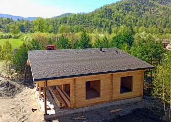 Наша бригада закончила монтаж финишного покрытия кровли, а также водосточной системы. Здесь наш заказчик выбрал мягкую кровлю. В строительстве мы использовали клееный брус собственного производства из сосны и кедра с сечением 205х185 мм. Это индивидуальный проект нашего заказчика. Общая площадь дома составляет 111 квадратных метров.