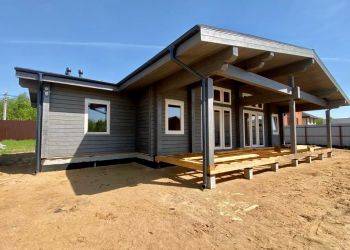 Завершили внешние окрашивание дома. За основу взят наш типовой проект Анси, с индивидуальными изменениями. Площадь дома составит 195 м2. В строительстве мы использовали клеёный брус собственного производства из сосны 205х185 мм.