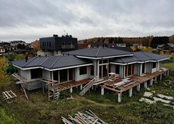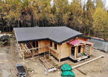 Завершили монтаж кровли.Сейчас наша бригада приступила к монтажу сруба бани!Дом будет построен по нашему типовому проекту Анси, с индивидуальными изменениями планировки.Площадь дома составит 181 м2.В строительстве мы используем клеёный брус собственного производства из сосны 205х185 мм.