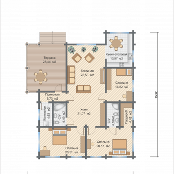 Полезная площадь проекта "Лион" - 169 кв.м. По проекту "Лион" - одноэтажное здание, которое также оснащено террасой. Площадь террасы – 28,44 кв.м.