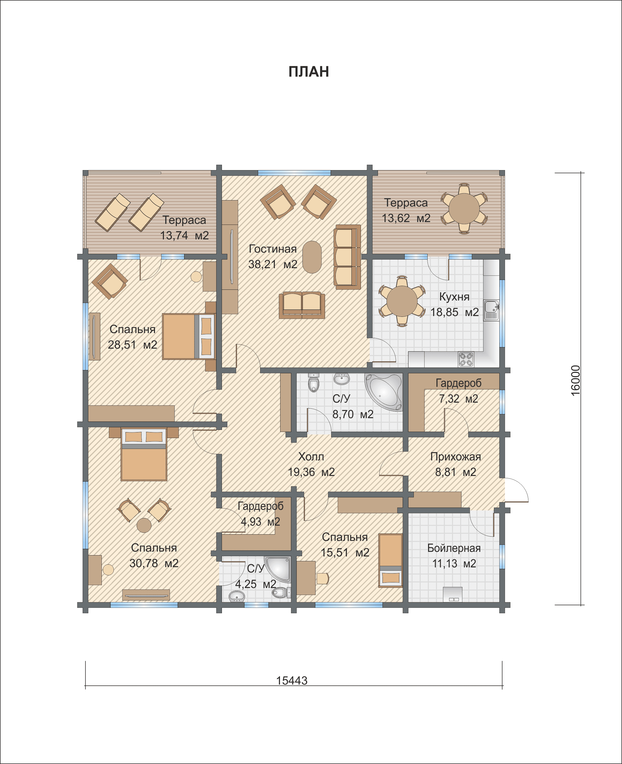 Полезная площадь проекта "Штутгарт" - 224 кв.м. По проекту "Штутгарт" - одноэтажное здание, которое оснащено большой террасой. Площадь террас составляет - 27,36 кв.м.