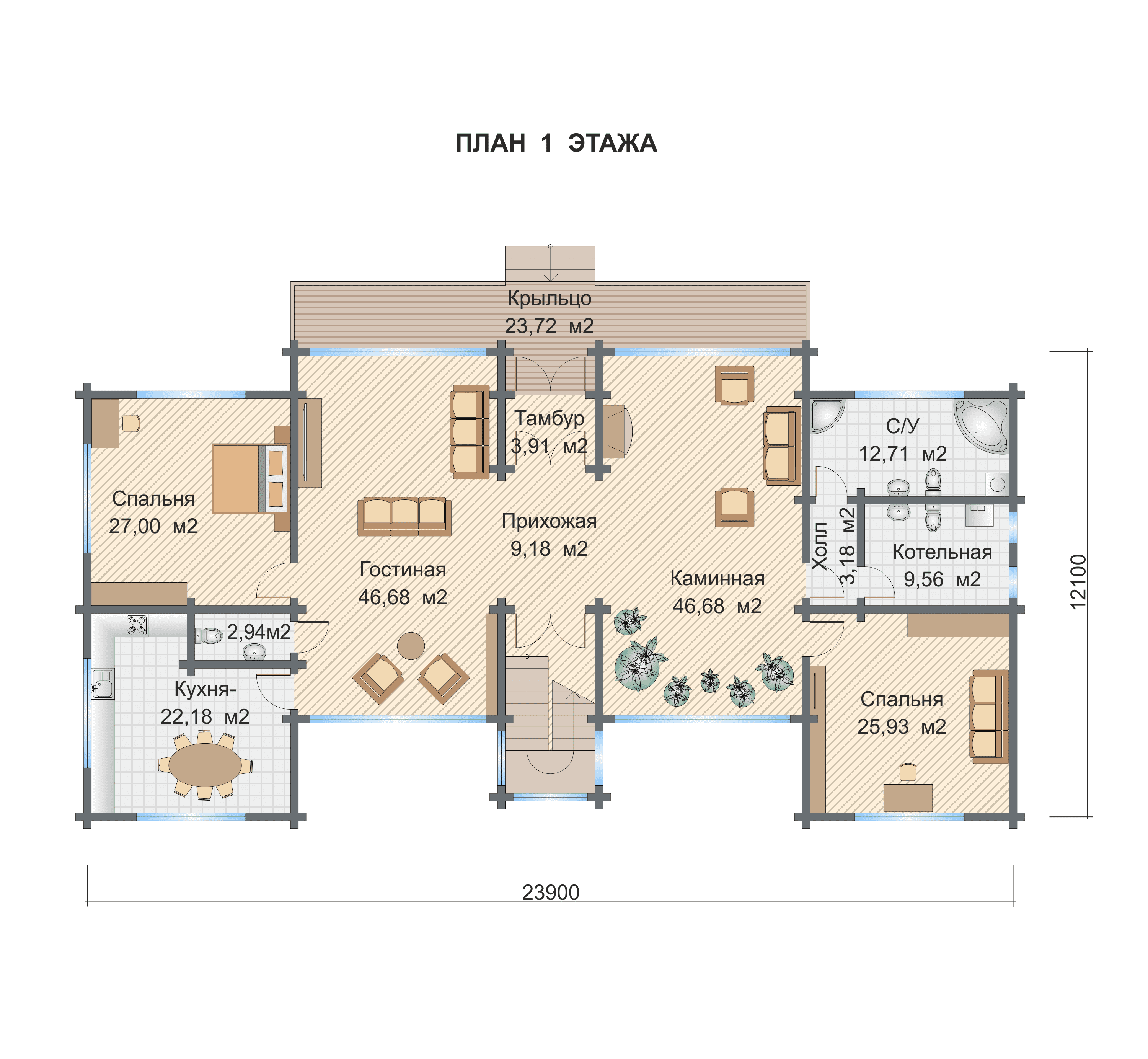 Полезная площадь проекта "Марсель" - 362 кв.м. Площадь крыльца составляет - 23,72 кв.м., площадь балкона - 20,64 кв.м.