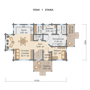 Также, в доме есть большая гостиная, совмещенная с кухней-столовой.