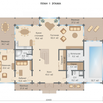 Полезная площадь проекта "Турин" - 494,4 кв.м. По проекту "Турин" - двухэтажное здание, которое также оснащено большим крыльцом, двумя уютными верандами. Площадь крыльца составляет - 21,9 кв.м, общая площадь двух веранд - 61,9 кв.м. Отличительной особенностью планировки проекта "Турин" является удобное расположение бассейна, оснащенного выходом на большую веранду, где можно расположить зону отдыха.