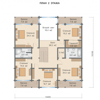 По проекту в здании есть 4 спальни + 1 мастер-спальня, которые можно переоборудовать под другие любые необходимые помещения. Каждая из спален имеет собственный балкон, площадью 7,8 кв.м. Также дом оборудован 4-мя С/У.