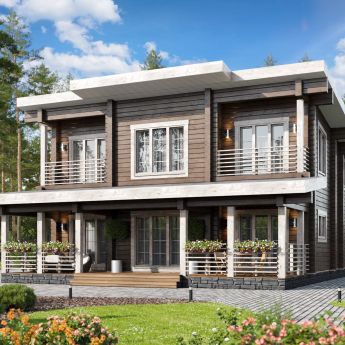 Дом из клееного бруса "Монреаль-1", площадь которого составляет 206 кв.м. По проекту "Монреаль-1" - двухэтажное здание, которое оснащено большой террасой, Выход на террасу осуществляется через просторную кухню-столовую, совмещенную с гостиной. В доме всего 4 спальни, 2 С/У.