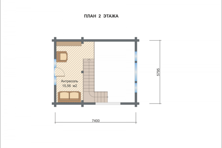На первом этаже дома-бани расположены банный комплекс, санузел и комната отдыха с небольшой кухней. Антресольный этаж предполагается использовать как спальню.